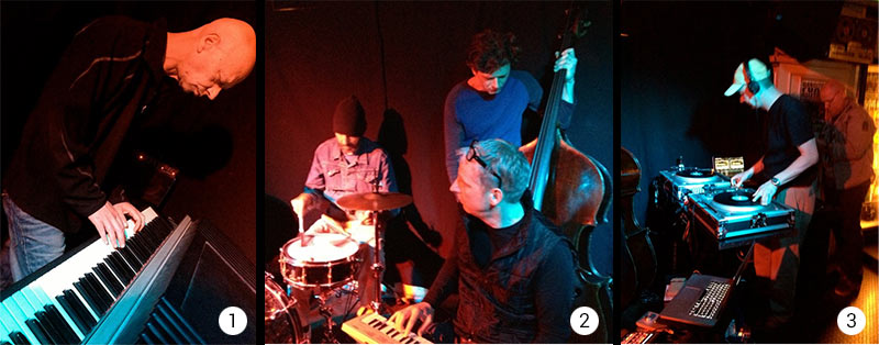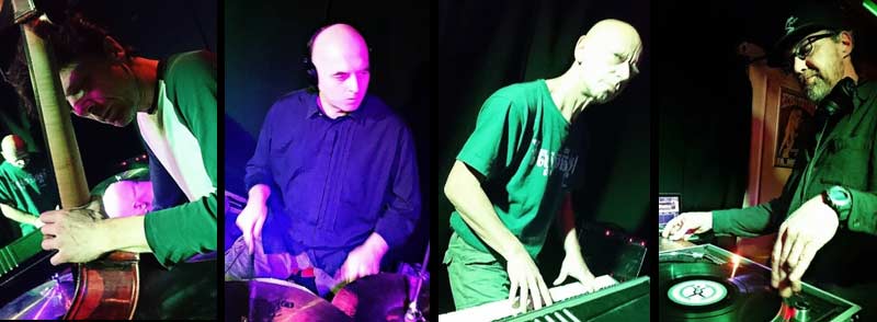 Von l. n. r.: Konstantin Wienstroer – Kontrabass, Josef Kirschgen – Drums, Jürgen Dahmen – E-Piano, DJ Heli – Turntables